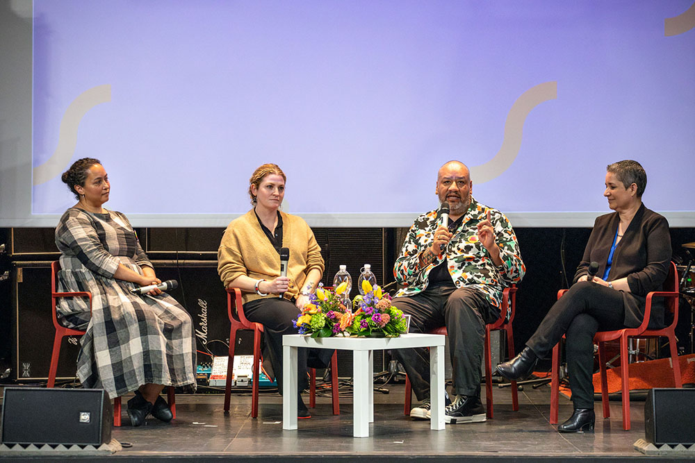 “The convening as a whole felt like an energizing disco, a kaleidoscopic exploration of Native identities in all their rich dualities, contrasts, and dichotomies: familiar and unfamiliar, past and future, joy and sorrow, detailed and monumental,” wrote Sháńdíín Brown (Navajo) for Hyperallergic.